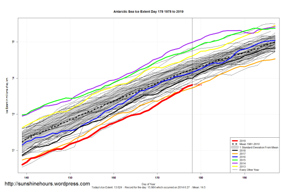 Sea Ice Extent (Global Antarctic and Arctic) – Day 178 – 2019