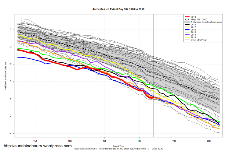 Sea Ice Extent (Global Antarctic and Arctic) – Day 184 – 2019