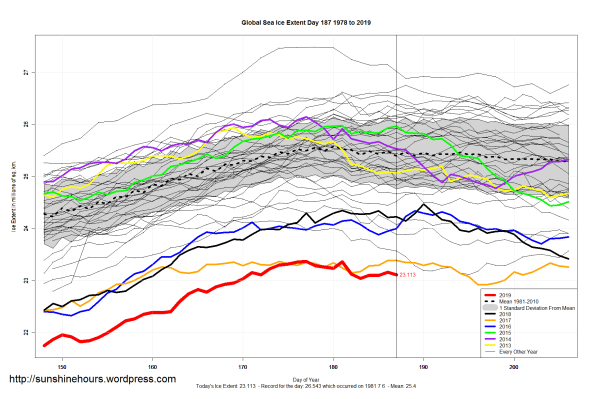 Sea Ice Extent (Global Antarctic and Arctic) – Day 187 – 2019