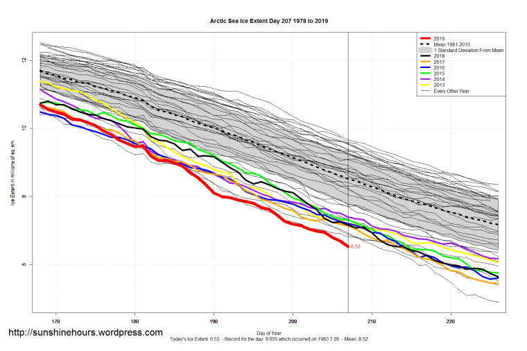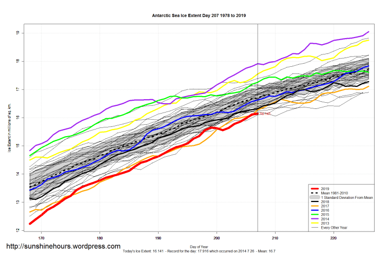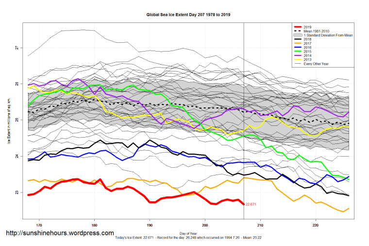 Sea Ice Extent (Global Antarctic and Arctic) – Day 207 – 2019 Published on July 27, 2019July 27, 2019 by sunshinehours1 South / North Like Loading... Related