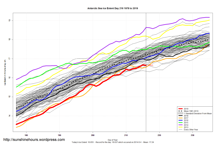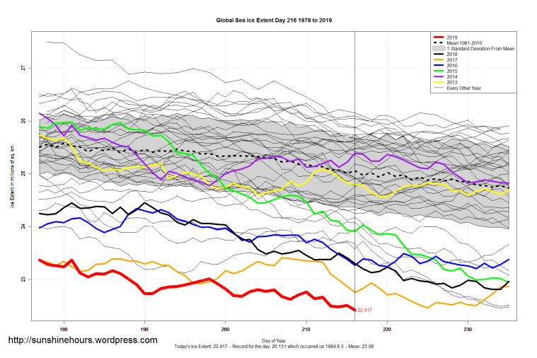 Sea Ice Extent (Global Antarctic and Arctic) – Day 216 – 2019 Published on August 5, 2019August 5, 2019 by sunshinehours1 South / North Like Loading... Related