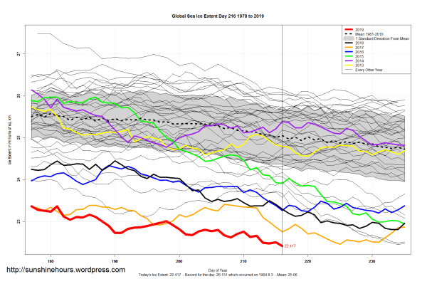 Sea Ice Extent (Global Antarctic and Arctic) – Day 216 – 2019