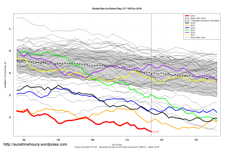 Sea Ice Extent (Global Antarctic and Arctic) – Day 217 – 2019 Published on August 6, 2019August 6, 2019 by sunshinehours1 South / North Like Loading... Related