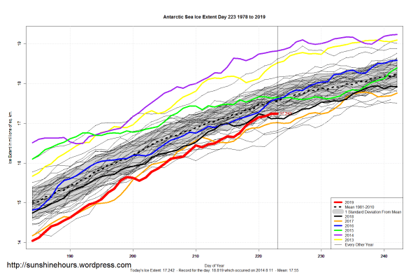 Sea Ice Extent (Global Antarctic and Arctic) – Day 223 – 2019