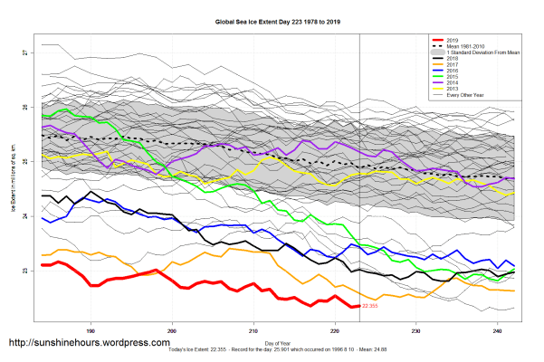 Sea Ice Extent (Global Antarctic and Arctic) – Day 223 – 2019