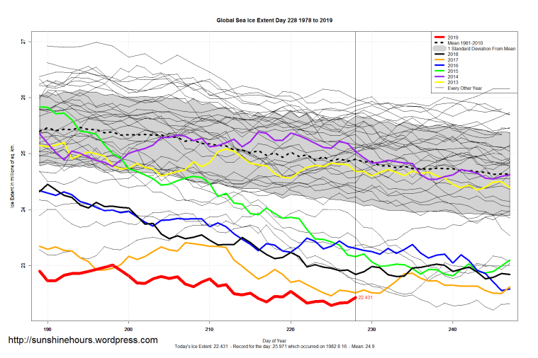 Sea Ice Extent (Global Antarctic and Arctic) – Day 228 – 2019 Published on August 17, 2019August 17, 2019 by sunshinehours1 South / North Like Loading... Related