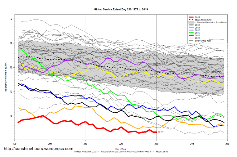 Sea Ice Extent (Global Antarctic and Arctic) – Day 230 – 2019 Published on August 19, 2019August 19, 2019 by sunshinehours1 South / North Like Loading... Related