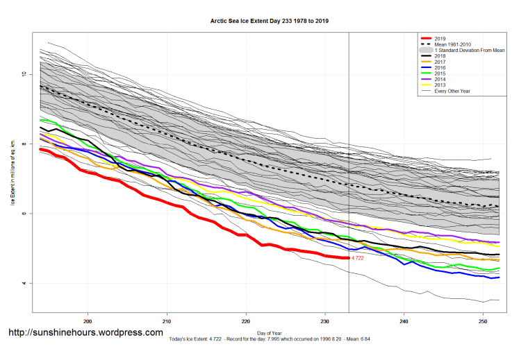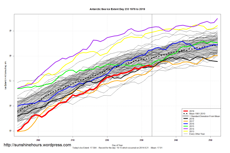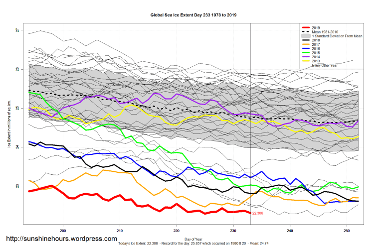 Sea Ice Extent (Global Antarctic and Arctic) – Day 233 – 2019 Published on August 22, 2019August 22, 2019 by sunshinehours1 South / North Like Loading... Related