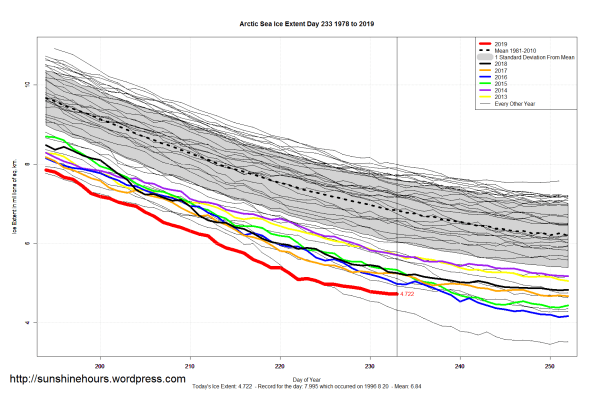 Sea Ice Extent (Global Antarctic and Arctic) – Day 233 – 2019