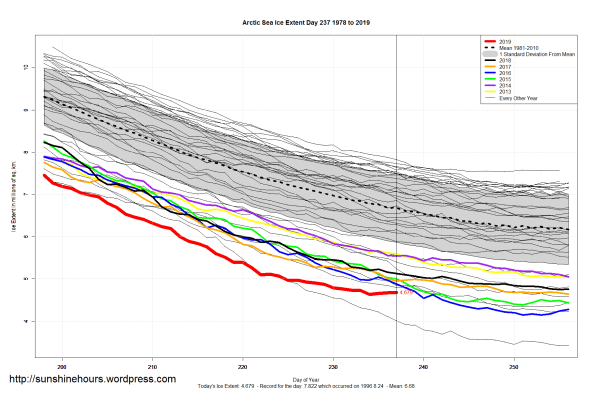 Sea Ice Extent (Global Antarctic and Arctic) – Day 237 – 2019