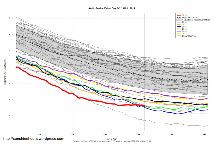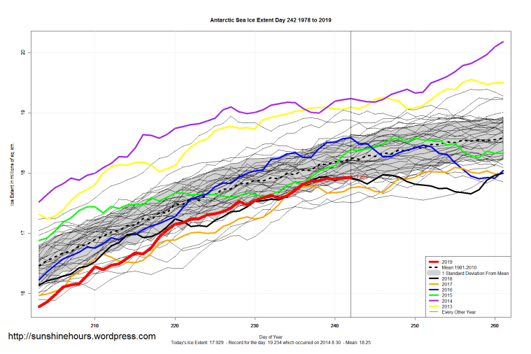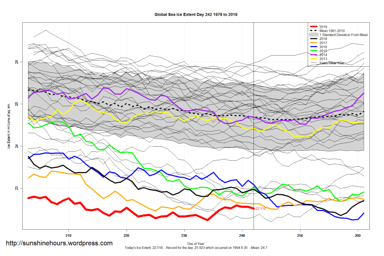 Arctic Higher Than 2012 2016 2007 – Sea Ice Extent (Global Antarctic and Arctic) – Day 242 – 2019 Published on August 31, 2019August 31, 2019 by sunshinehours1 South / North Like Loading... Related