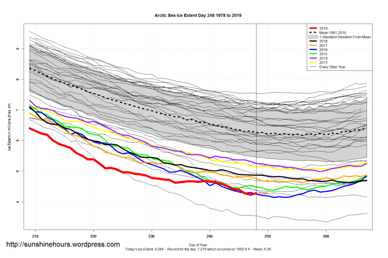 2 thoughts on “Sea Ice Extent (Global Antarctic and Arctic) – Day 248 – 2019