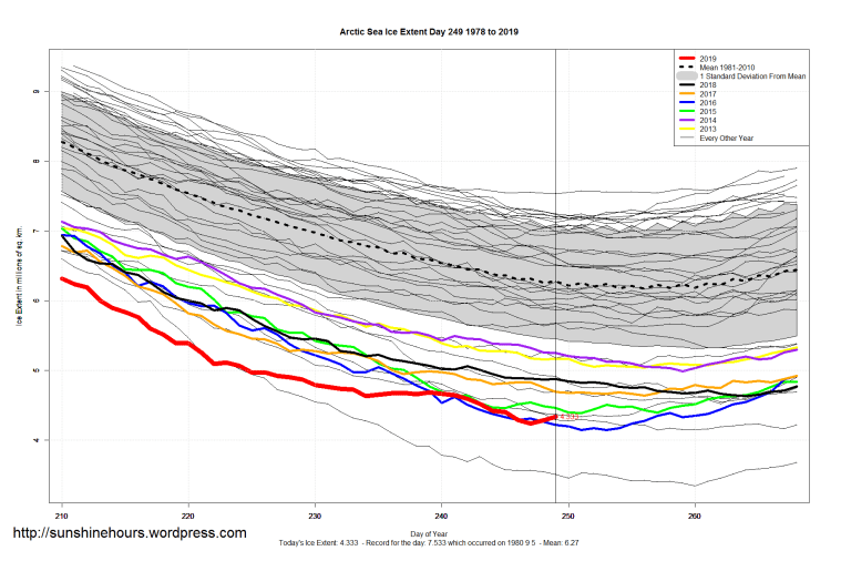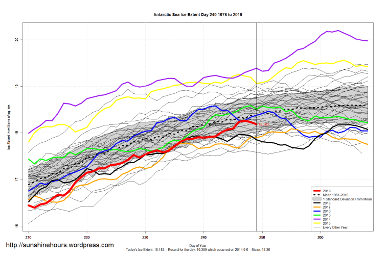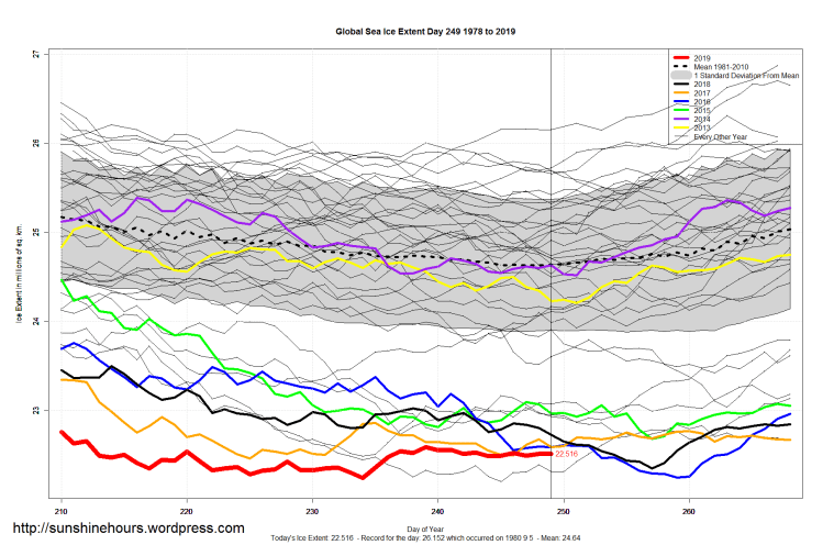 2 thoughts on “Sea Ice Extent (Global Antarctic and Arctic) – Day 249 – 2019