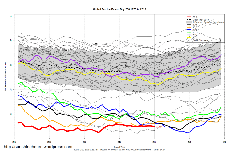 Sea Ice Extent (Global Antarctic and Arctic) – Day 250 – 2019 Published on September 8, 2019September 8, 2019 by sunshinehours1 South / North Like Loading... Related