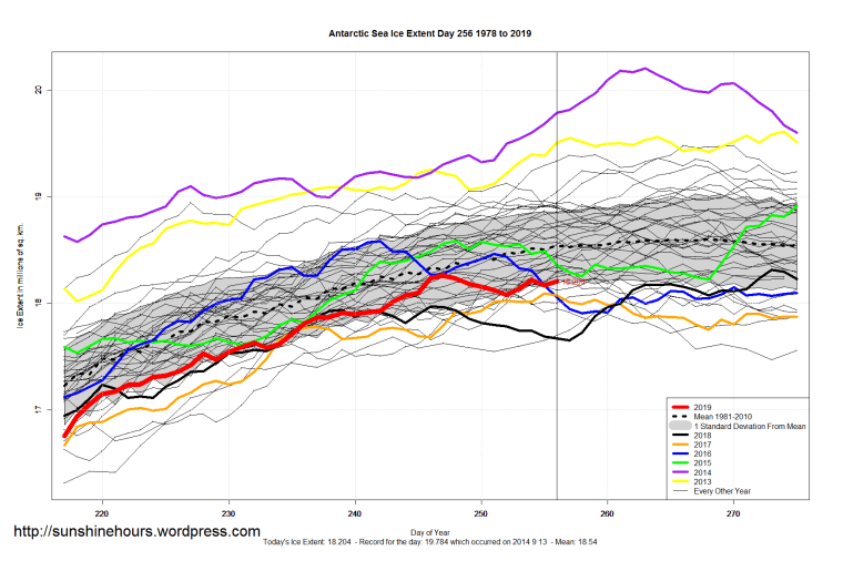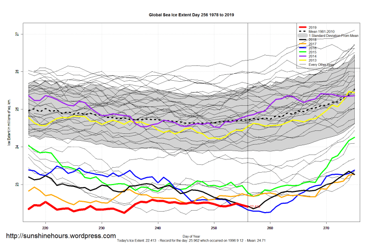 2 thoughts on “Sea Ice Extent (Global Antarctic and Arctic) – Day 256 – 2019