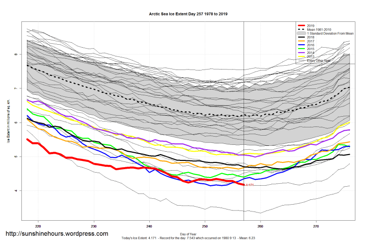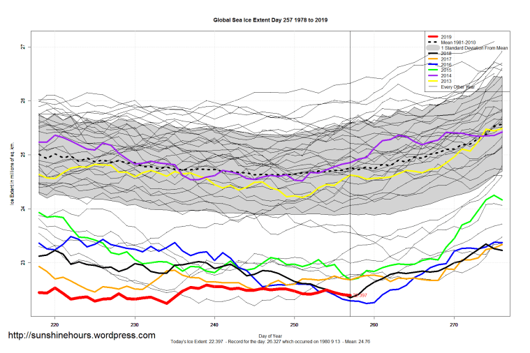 One thought on “Sea Ice Extent (Global Antarctic and Arctic) – Day 257 – 2019