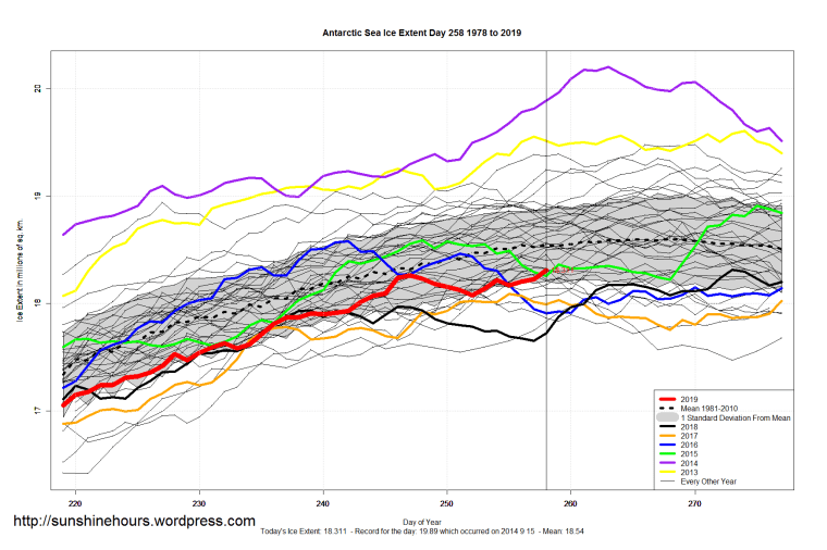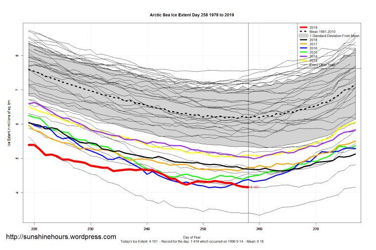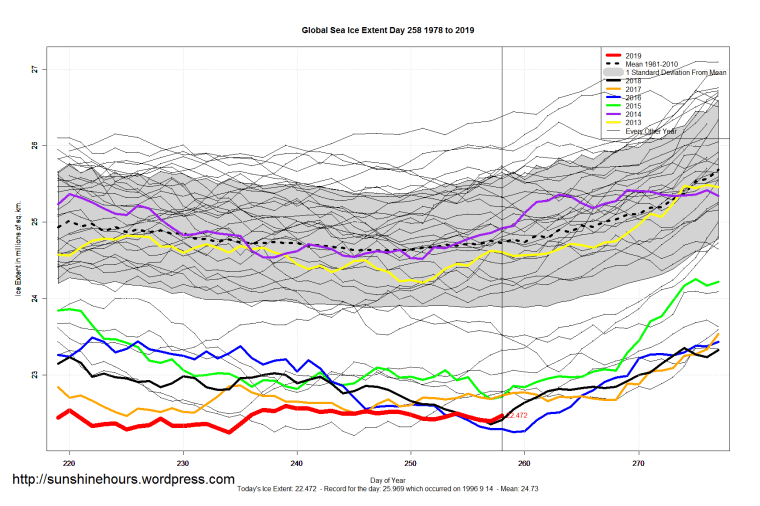 2 thoughts on “Sea Ice Extent (Global Antarctic and Arctic) – Day 258 – 2019