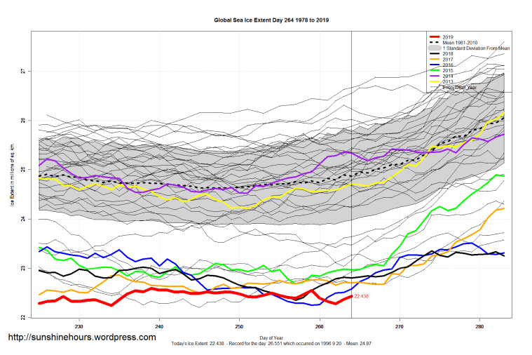 2 thoughts on “Sea Ice Extent (Global Antarctic and Arctic) – Day 264 – 2019