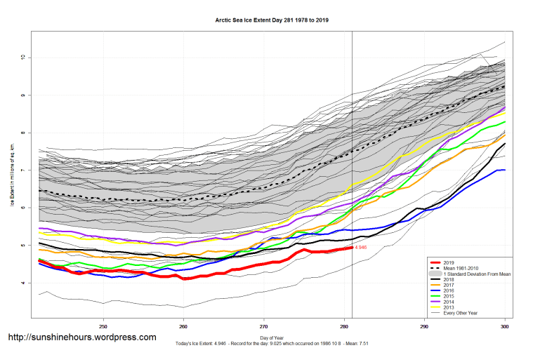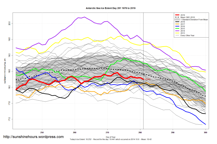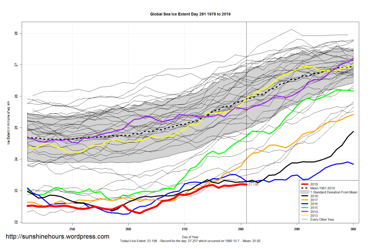 2 thoughts on “Sea Ice Extent (Global Antarctic and Arctic) – Day 281 – 2019