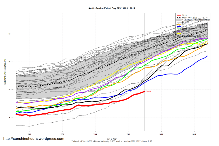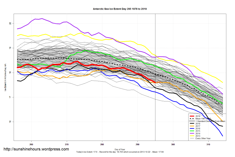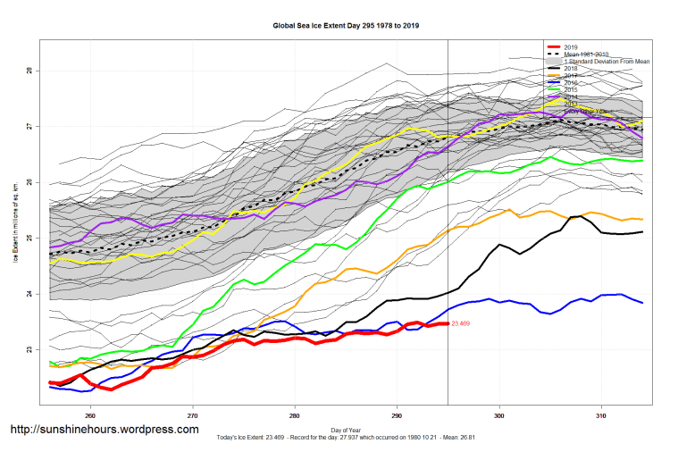 2 thoughts on “Sea Ice Extent (Global Antarctic and Arctic) – Day 295 – 2019