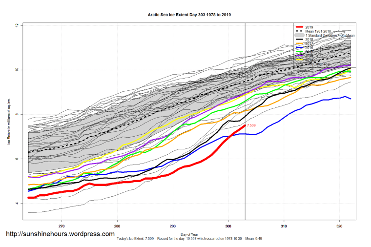Sea Ice Extent (Global Antarctic and Arctic) – Day 303 – 2019 Published on October 31, 2019October 31, 2019 by sunshinehours1 South / North Like Loading... Related