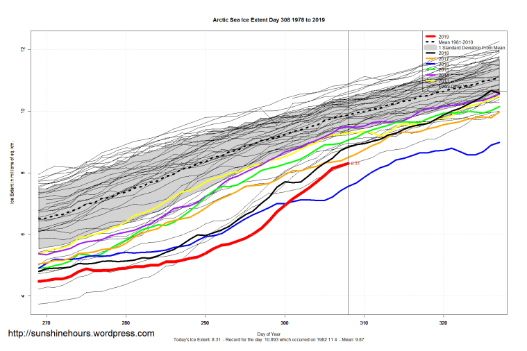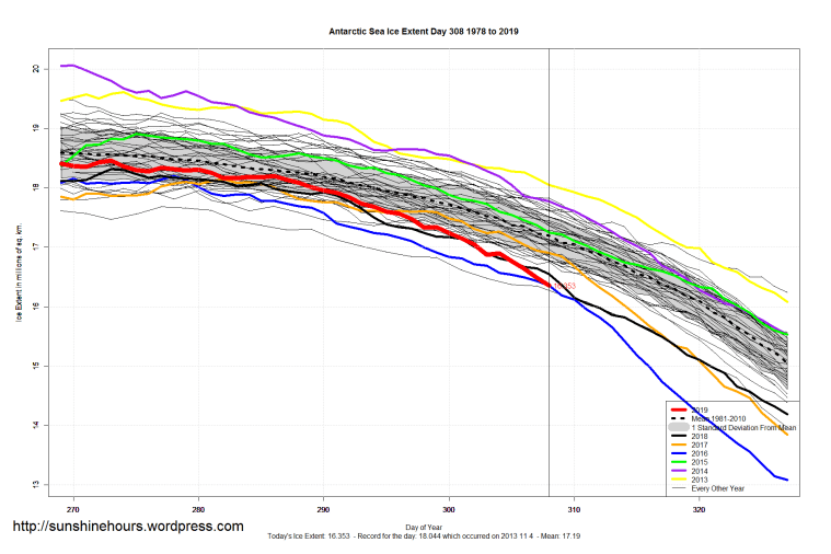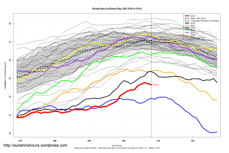 Sea Ice Extent (Global Antarctic and Arctic) – Day 308 – 2019 Published on November 5, 2019November 5, 2019 by sunshinehours1 South / North Like Loading... Related