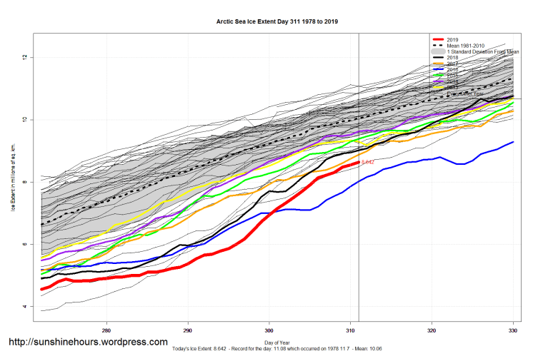 2 thoughts on “Sea Ice Extent (Global Antarctic and Arctic) – Day 311 – 2019