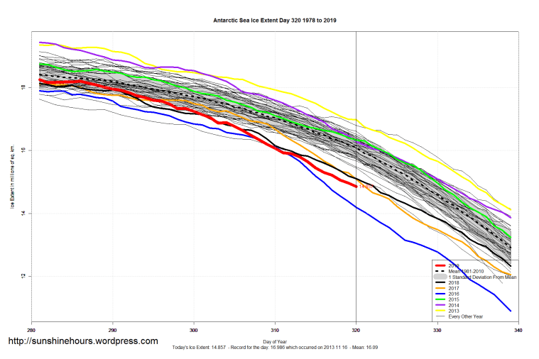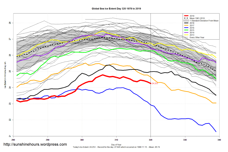 2 thoughts on “Sea Ice Extent (Global Antarctic and Arctic) – Day 320 – 2019