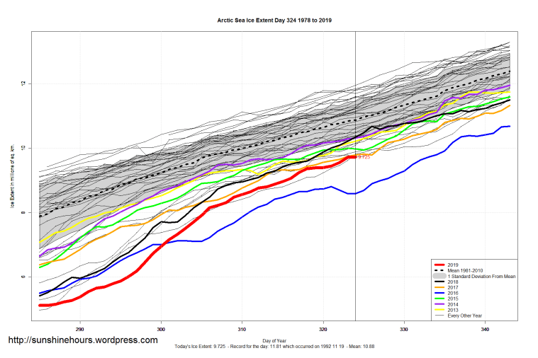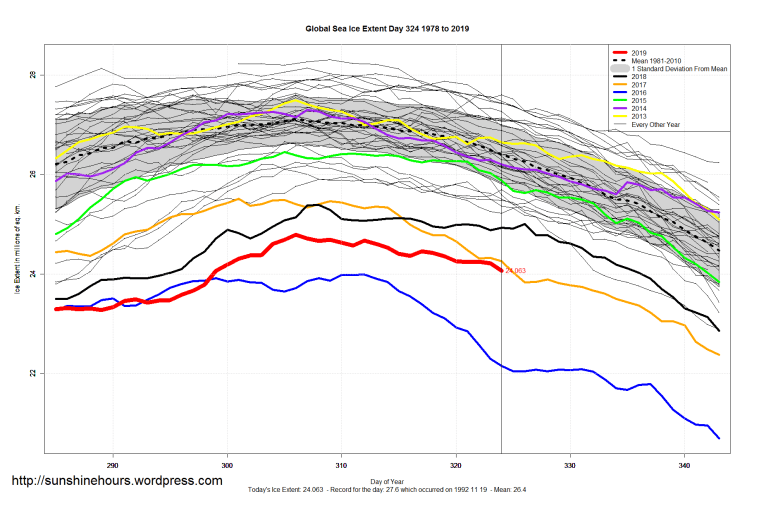 2 thoughts on “Sea Ice Extent (Global Antarctic and Arctic) – Day 324 – 2019