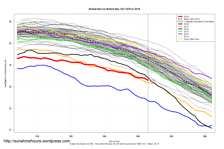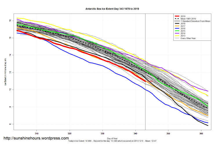 10th Lowest Arctic – Sea Ice Extent (Global Antarctic and Arctic) – Day 343 – 2019 Published on December 10, 2019December 10, 2019 by sunshinehours1 10th Lowest Arctic – 2016 2017 2018 2007 2010 2006 2015 2009 2012 were lower than 2019. South / North Like Loading... Related