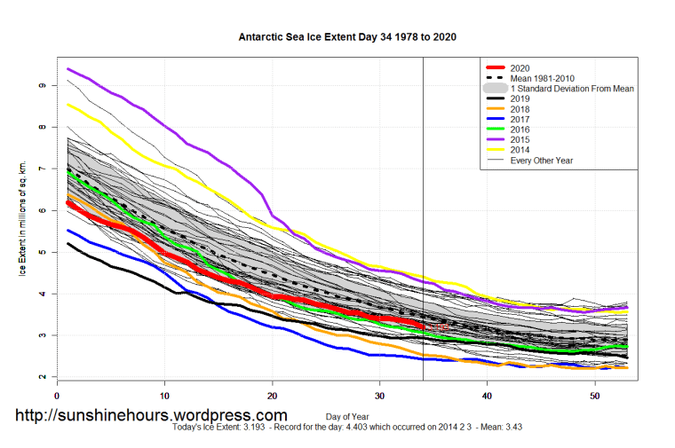 2 thoughts on “Sea Ice Extent (Global Antarctic and Arctic) – Day 34 – 2020