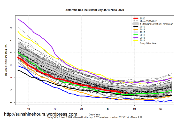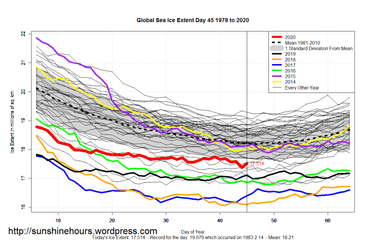 Sea Ice Extent (Global Antarctic and Arctic) – Day 45 – 2020 Published on February 15, 2020February 15, 2020 by sunshinehours1 South / North Like Loading... Related