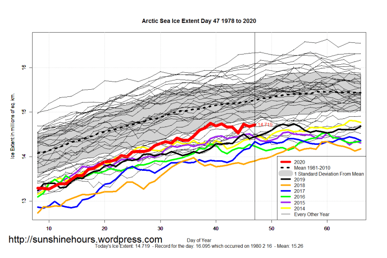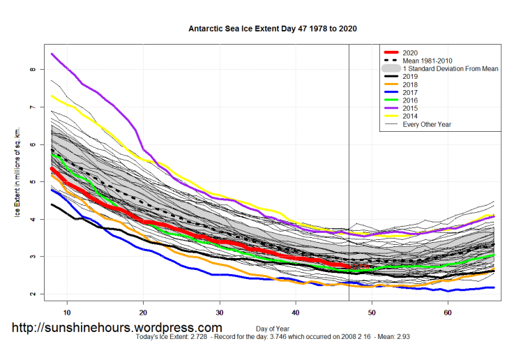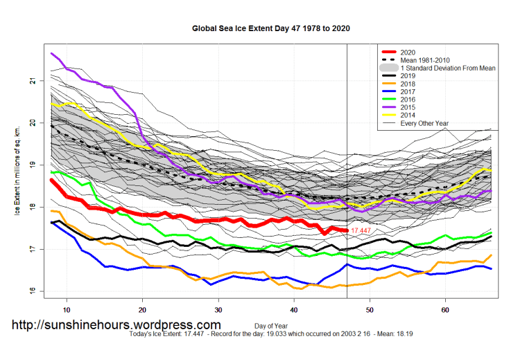 Sea Ice Extent (Global Antarctic and Arctic) – Day 47 – 2020 Published on February 17, 2020February 17, 2020 by sunshinehours1 South / North Like Loading... Related
