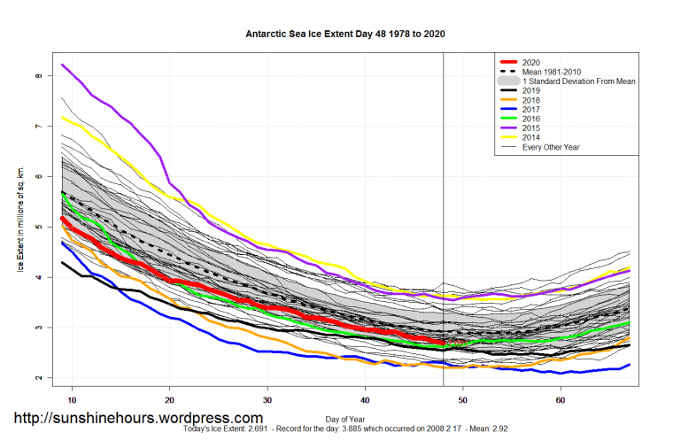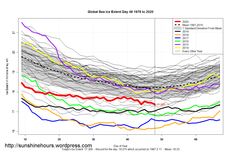 Sea Ice Extent (Global Antarctic and Arctic) – Day 48 – 2020 Published on February 18, 2020February 18, 2020 by sunshinehours1 South / North Like Loading... Related