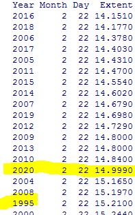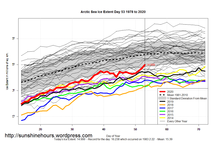 Sea Ice Extent (Global Antarctic and Arctic) – Day 53 – 2020 Published on February 23, 2020February 23, 2020 by sunshinehours1 Wow. The 2020 Arctic Extent is so close to 1995. South / North Like Loading... Related