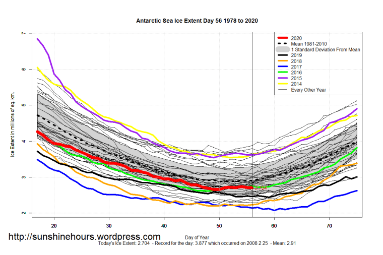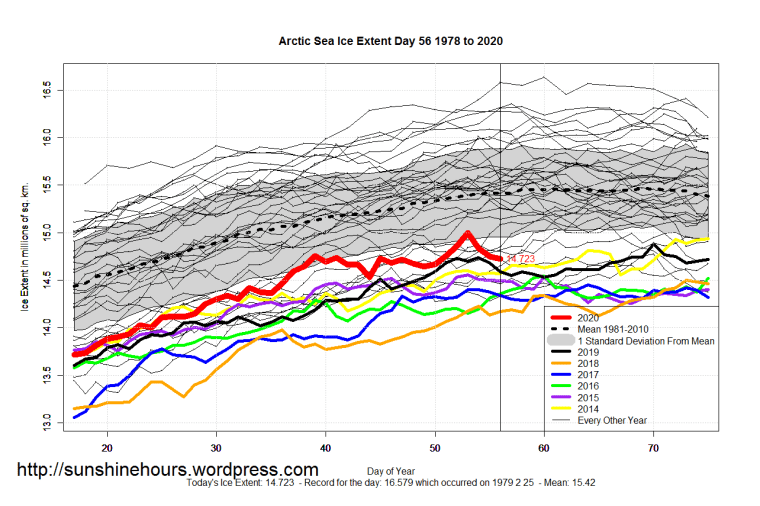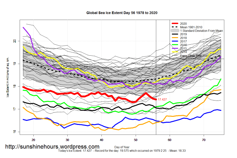 Sea Ice Extent (Global Antarctic and Arctic) – Day 56 – 2020 Published on February 26, 2020February 26, 2020 by sunshinehours1 South / North Like Loading... Related