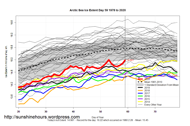 Sea Ice Extent (Global Antarctic and Arctic) – Day 59 – 2020 Published on February 29, 2020February 29, 2020 by sunshinehours1 South / North Like Loading... Related