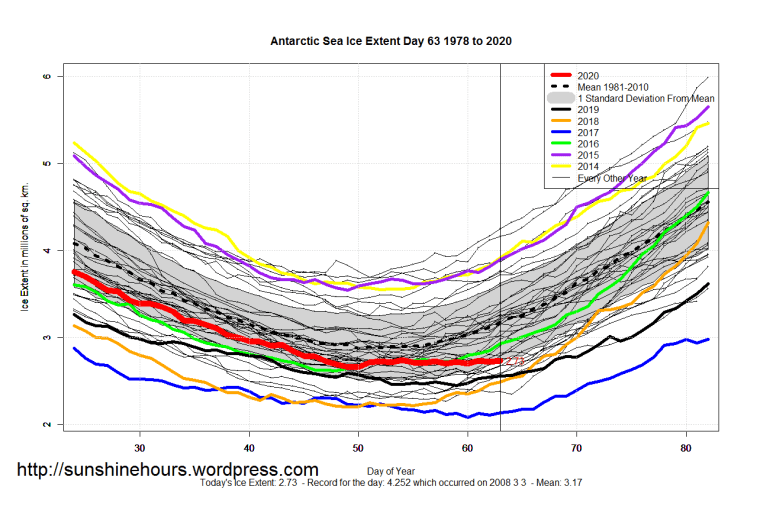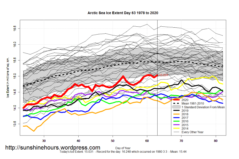Sea Ice Extent (Global Antarctic and Arctic) – Day 63 – 2020 Published on March 4, 2020March 4, 2020 by sunshinehours1 South / North Like Loading... Related