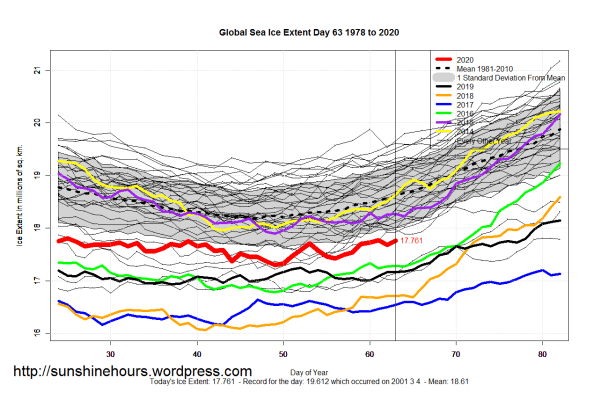 Sea Ice Extent (Global Antarctic and Arctic) – Day 63 – 2020