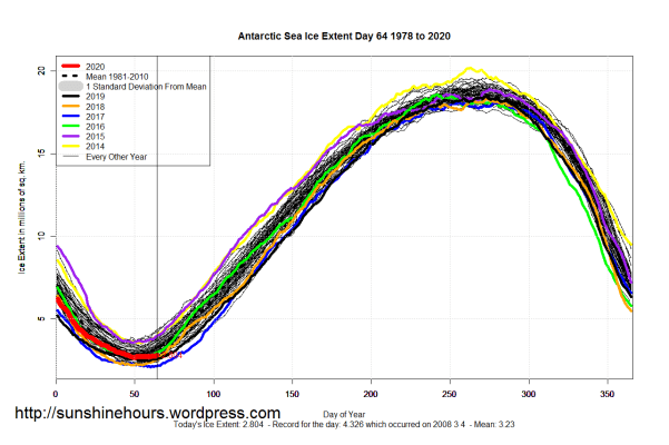 Arctic Only 90,000 sqkm Lower Than 1996 – Sea Ice Extent (Global Antarctic and Arctic) – Day 64 – 2020