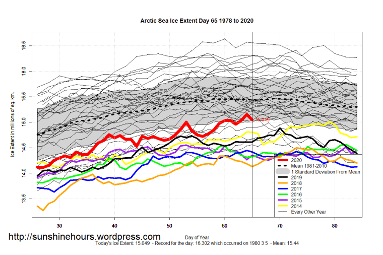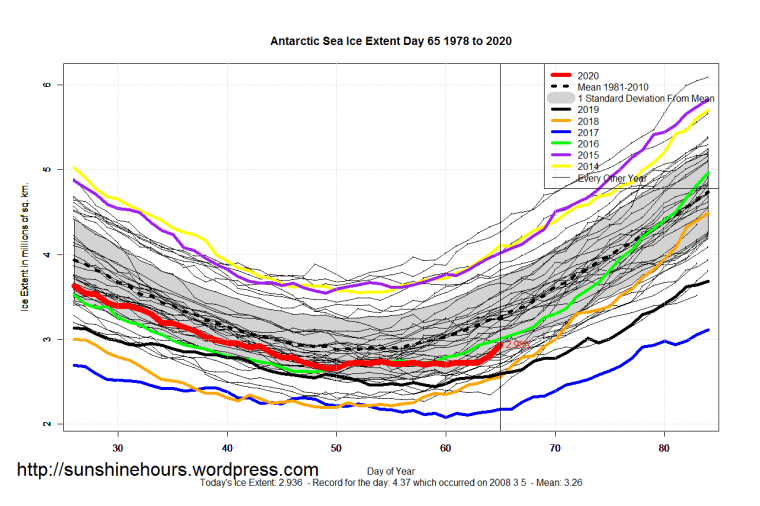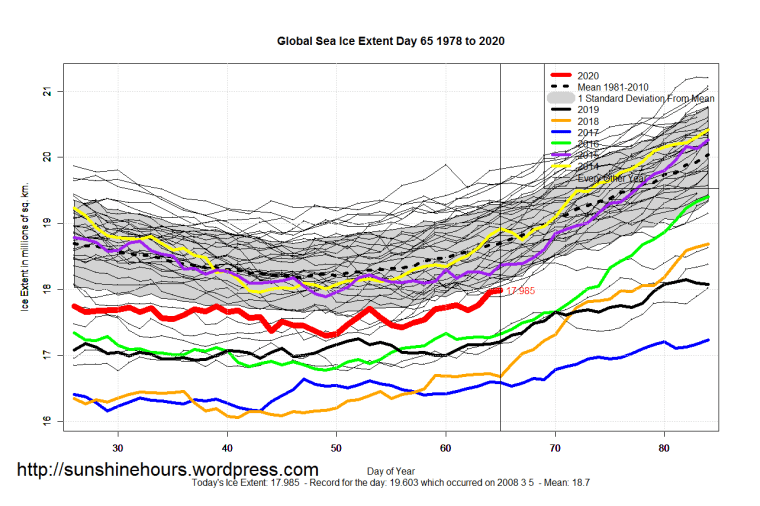 2 thoughts on “Sea Ice Extent (Global Antarctic and Arctic) – Day 65 – 2020
