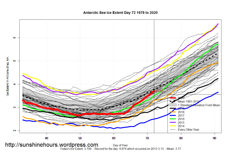 Sea Ice Extent (Global Antarctic and Arctic) – Day 72 – 2020 Published on March 13, 2020March 13, 2020 by sunshinehours1 South / North Like Loading... Related