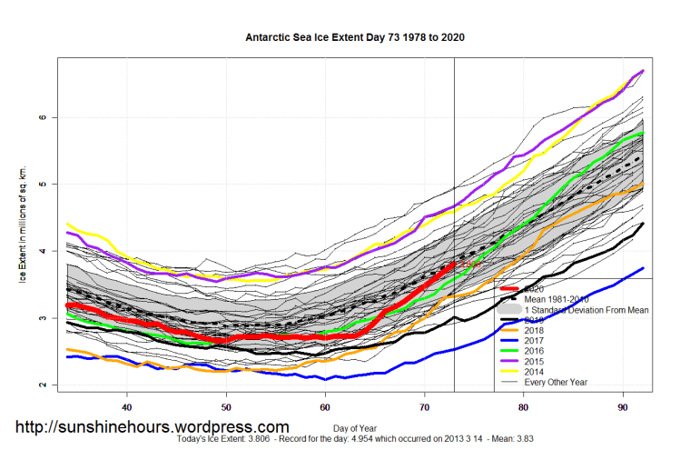 Sea Ice Extent (Global Antarctic and Arctic) – Day 73 – 2020 Published on March 14, 2020March 14, 2020 by sunshinehours1 South / North Like Loading... Related