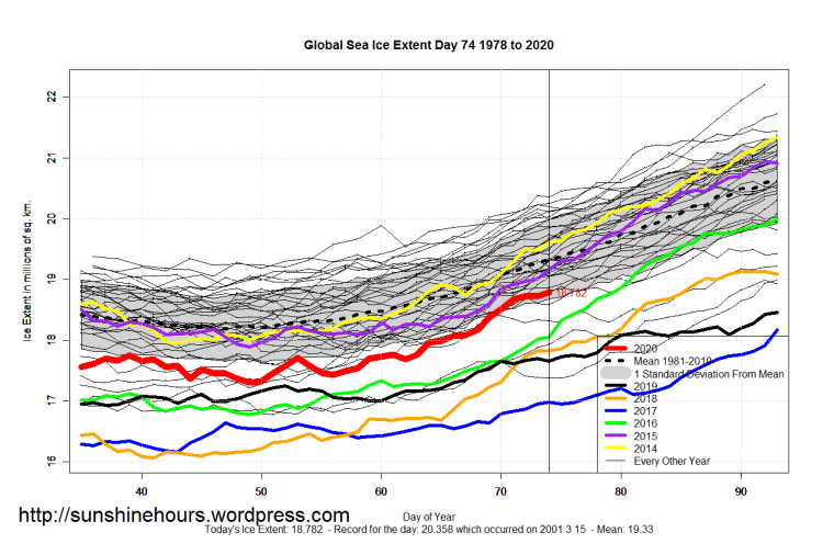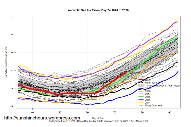 Antarctica Just Above The Mean – Sea Ice Extent (Global Antarctic and Arctic) – Day 74 – 2020 Published on March 15, 2020March 17, 2020 by sunshinehours1 South / North Like Loading... Related