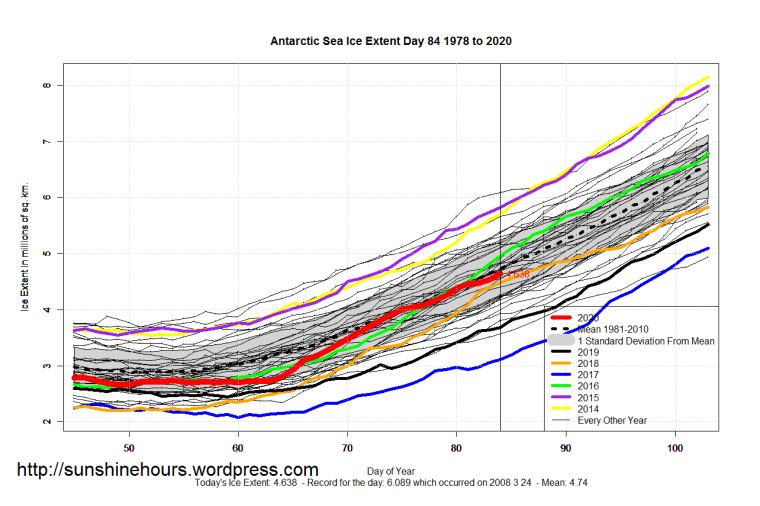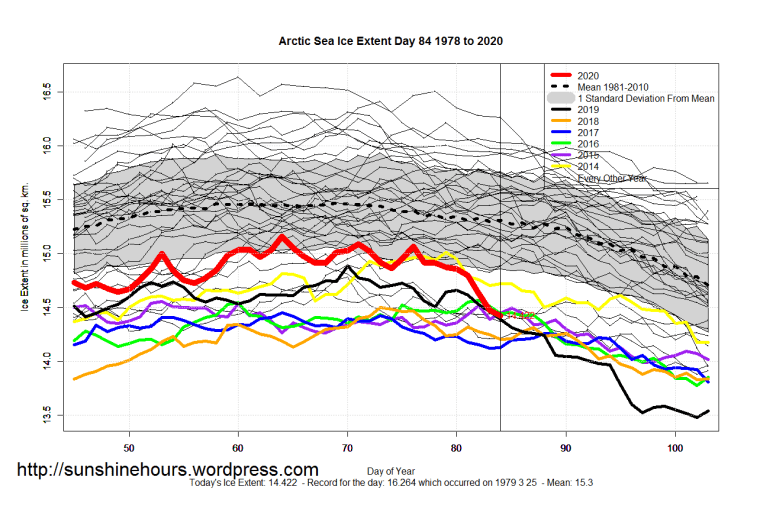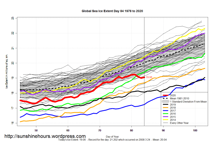 Sea Ice Extent (Global Antarctic and Arctic) – Day 84 – 2020 Published on March 25, 2020March 25, 2020 by sunshinehours1 South / North Like Loading... Related