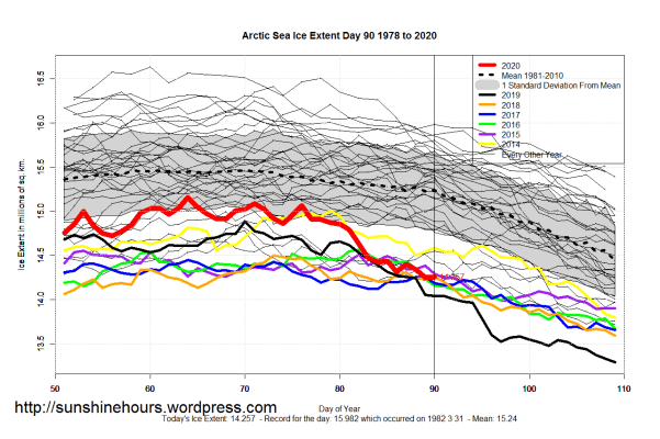 Sea Ice Extent (Global Antarctic and Arctic) – Day 90 – 2020