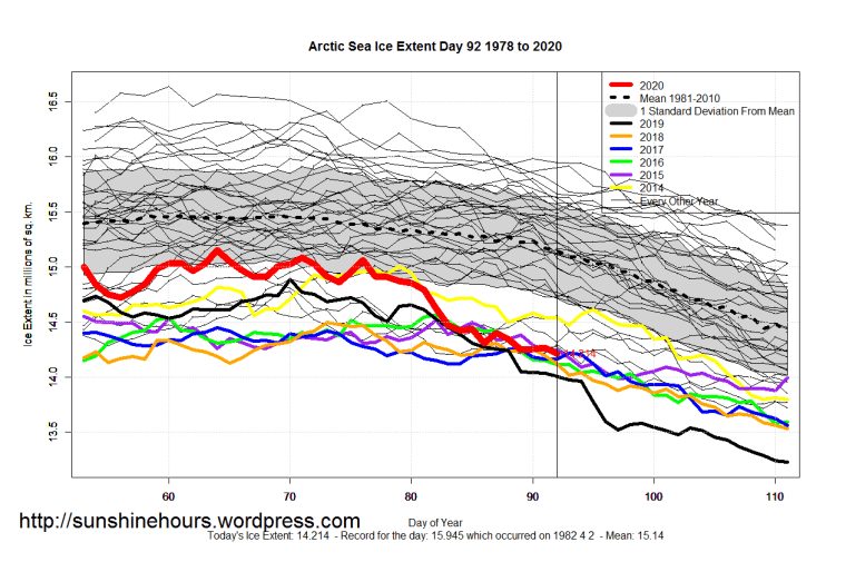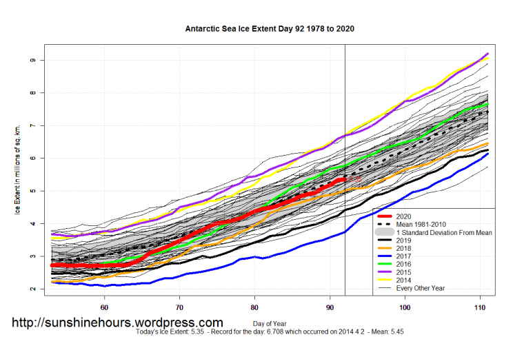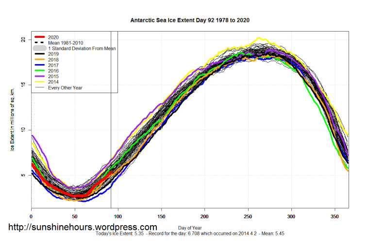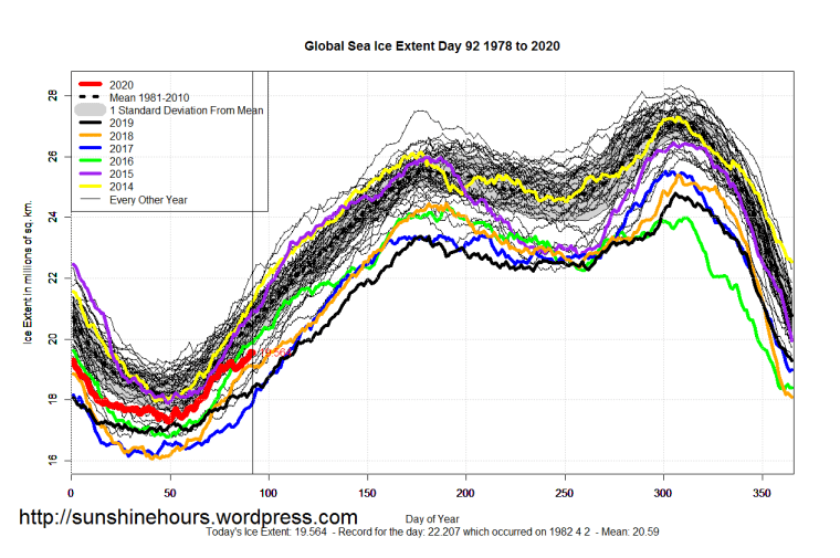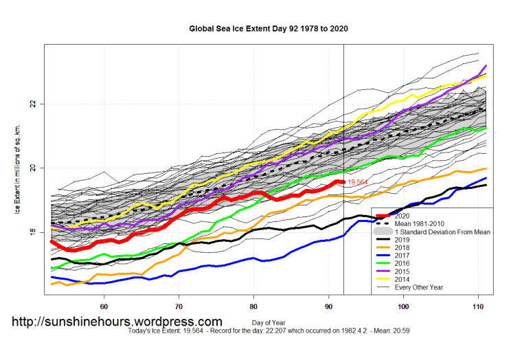 Sea Ice Extent (Global Antarctic and Arctic) – Day 92 – 2020 Published on April 2, 2020April 2, 2020 by sunshinehours1 All 6 South / North Like Loading... Related