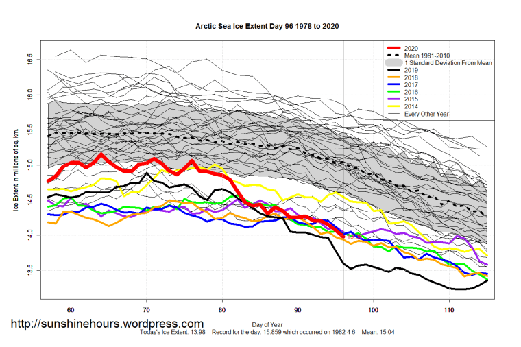 Sea Ice Extent (Global Antarctic and Arctic) – Day 96 – 2020 Published on April 6, 2020April 6, 2020 by sunshinehours1 South / North Like Loading... Related