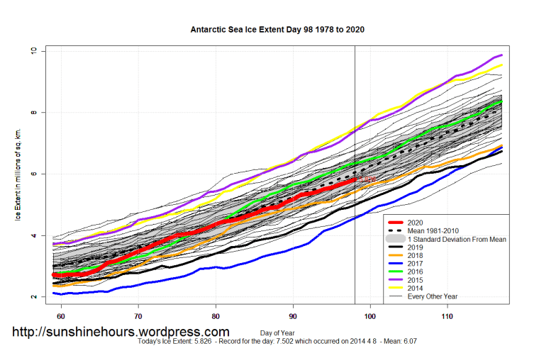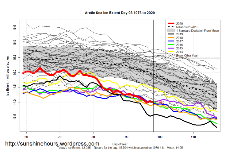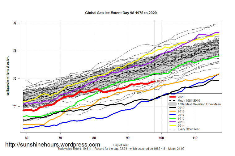 Sea Ice Extent (Global Antarctic and Arctic) – Day 98 – 2020 Published on April 8, 2020April 8, 2020 by sunshinehours1 South / North Like Loading... Related