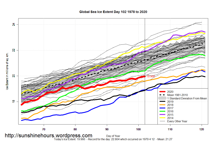 Sea Ice Extent (Global Antarctic and Arctic) – Day 102 – 2020 Published on April 12, 2020April 12, 2020 by sunshinehours1 South / North Like Loading... Related